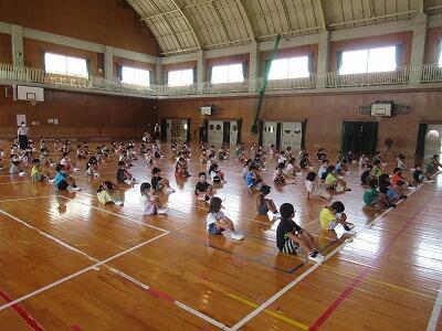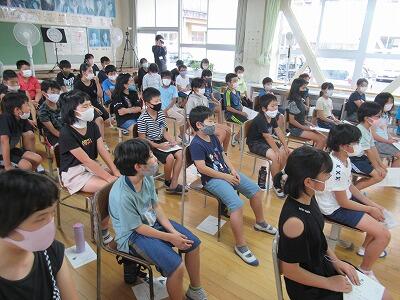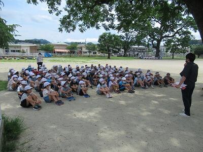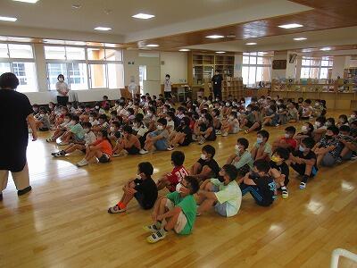1年生は体育館、3年生は多目的スペース、5年生は運動場で行いました。学年で統一した指導をしたり児童同士の交流を深めたりすることを目的としています。今日は、担当の職員が生活や学習についての話をしました。