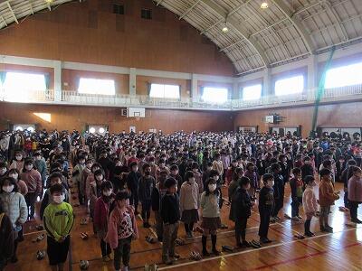 昨年度から、体育館に全校で集まることが全くできませんでした。約2年ぶりに体育館に全校児童が集まることができ、たいへん嬉しく感じました。約670名の児童が体育館に入った様子は圧巻でした。