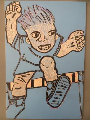 ハードルを跳んでいる場面を木版画に表して、彫刻刀で彫り進めています。手、足、顔の部分をしわの線に合わせながら一彫り、一彫り、小丸刀で彫っています。繰り返しの作業に、「はぁー」と言いながら頑張っています。