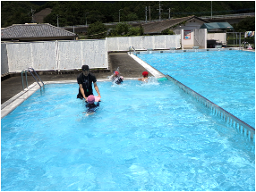 朝から青空です。今日は子どもたちが待ちに待ったプールの日です。「浮けるようになった子ども」、「25mまであともう少し子ども」、「ビート板で使ってバタ足が上手になった子ども」など、学年によって目標は違いますが、1人1人がとても成長したと思います。