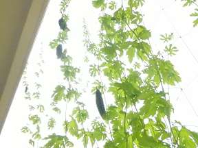 ゴーヤは手の届かないところに大きな実をつけています。収穫がたいへんです。 キュウリも順調に生長しています。