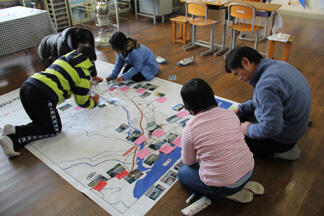 本日は、大きな熊野江区の地図に「危険な場所」、「おたすけハウス」、「津波避難場所」の写真やカードを貼っていく作業をしました。 ピンクのカードには危険な場所の説明、緑のカードには、おたすけハウスの場所が書いてあります。