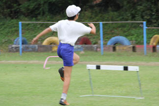 本日の体育は、1~4年まではハードルで、5~6年は走り幅跳びです。ハードルは学年に応じて、3段階に分けて学習しました。 5~6年は、陸上運動教室に向けて練習しました。