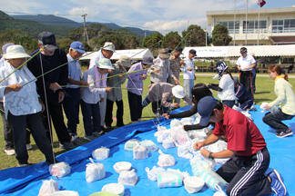 本日、PTA主催の小・中学生を祝う餅まきがありました。小・中学校の保護者の皆様が前日から準備をしました。当日は朝早くから、約30㎏のもち米を蒸し、餅つきをしました。小・中学生も参加し、餅をついたり、餅をこねたりしてお手伝いをしました。