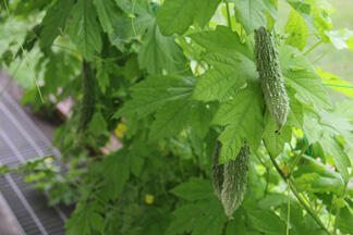 真夏日が続きますが、ひょうたんは白い花を咲かせ、小さな実をつけました。ゴーヤも黄色い花を咲かせています。太陽の光を浴びて、順調に生長しています。