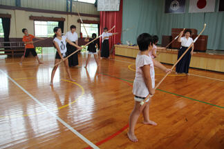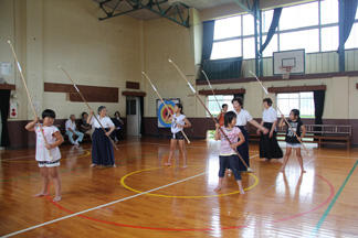 7月17日(金)、放課後子ども教室でなぎなた教室がありました。今回が最後のなぎなた教室です。正式に袴を着て、なぎなたの基本動作(上段、中段、下段、八相の構え)を練習しましたが、1年生もなぎなたの振り方が上手になってきました。