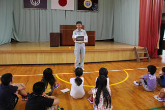 7月の全校朝会は県水産振興協会事務局長の外山さんから「県水産振興協会」で育てている魚の話をしていただきました。ヒラメ、鯛など子どもたちが知っている魚がたくさん出てきました。