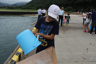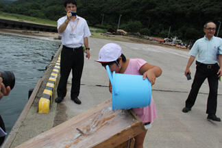 熊野江港で稚魚の放流祭がありました。県水産振興協会が準備していただいたヒラメとマダイの稚魚100匹ずつを放流しました。熊野江小学校は毎年参加しているので、2年以上は体験ずみです。1年3名にとっては初めての放流でしたが、10㎝ぐらいの稚魚を放流台から海に放しました。