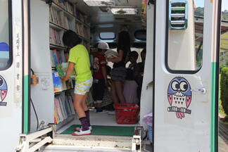 本日(5月22日)は移動図書館「ふくろう号」が来る日です。子どもたちは自分が読みたい本を10冊まで借りることができ、来月の「ふくろう号」の日に返本します。さて、読みたい本は見つかったかな。