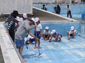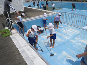 本校は、南浦中にあるプールを使いますので、プール清掃は南浦中の生徒と合同で行います。小学校の担当は、低学年が主に使用する小プールを担当しました。2時間かけて、プールの床と側面を磨きました。これで、6月5日(金)のプール開きを待つだけです。