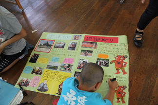 大きな模造紙に写真をたくさん貼り、福沢諭吉邸・記念館や地獄巡りのレポートをマジックで書き込みました。吹き出しを書いたり、クイズコーナーを作ったり、担任の先生とアイディアを出し合いながら楽しく作り上げています。できあがったものは、5月31日の参観日で発表を行う予定です。
