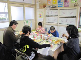 お昼には給食を一緒に食べました。今日の献立の感想や好きなメニューなどをそれぞれの班で話しながら楽しくを会食することができました。
