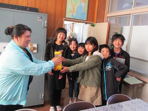 集めた金額の半額3,683円を代表児童が手渡しました。