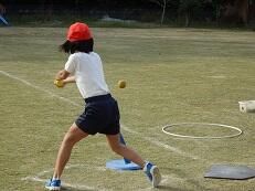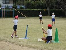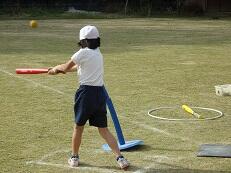 今日の「ティーボール」は、ボールの投げ方、取り方、打ち方の練習をした後、試合をしました。結果は25対25の引き分けでした。打ち方も上手になり、空振りする子どもはいなかったです。