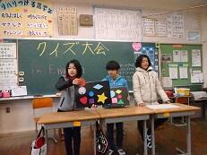 5・6年は外国語活動で学習したことを生かしたクイズ大会を行いました。答えるのは、先生方です。子どもたちと先生方の真剣勝負です。次から次に出る難問に先生方も考え込むことがしばしばありました。