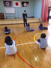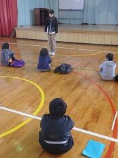 2月の全校朝会は、地域の方3名を招いて、昔の熊野江小学校の話をしていただきました。