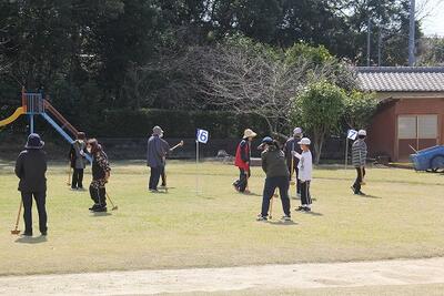 毎週水曜日に実施する地域の方々とのグラウンドゴルフの2回目を3月13日に行いました。地域の方14名が参加してくださり、にぎやかにグラウンドゴルフを楽しみました。みなさん、ゴールをめがけて球筋よく打ち、上手なのに驚かされます。この日は、地域の方1名が、ホールインワンを出しました。すごいです!