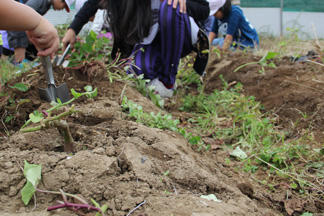 放課後子ども教室で、サツマイモの収穫とタマネギの苗を植えました。みんなで、土の中のイモを全部収穫しました。昨年度より、収穫量は少なかったです。タマネギは来年の5月に収穫します。