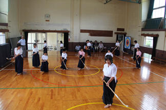 7月17日(金)、放課後子ども教室でなぎなた教室がありました。今回が最後のなぎなた教室です。正式に袴を着て、なぎなたの基本動作(上段、中段、下段、八相の構え)を練習しましたが、1年生もなぎなたの振り方が上手になってきました。