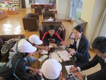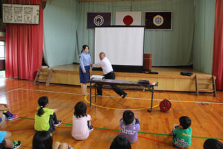 避難訓練兼が終わった後に、集会室で、「学校での安全」と「学校外での安全」について、子どもたちに話していただきました。