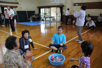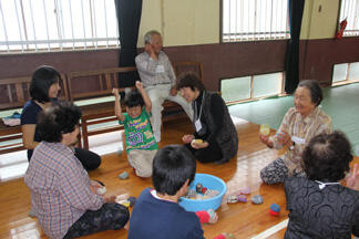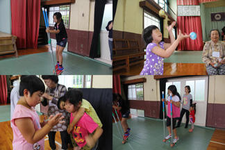 今回は「独楽」や「剣玉」「あやとり」「竹馬」「おじゃみ」を使い、地域の方と一緒に昔の遊びを体験しました。