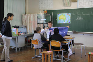 4月14日(火)、新年度になってから初めてのALT訪問がありました。今年度もALTの先生はニルソン先生です。授業の行われた5・6年生の教室では、先生の自己紹介がありました。先生の出身国であるオーストラリアの地図や国旗を見せていただきました。給食の時間には一緒にカレーライスをいただきました。とても美味しかったです。昼休みには一緒にサッカーで遊びました。1年生も混じって運動場を走り回りました。