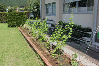 6月10日(水)に職員室、校長室前にグリーンカーテンを設置しました。職員室前にゴーヤの苗を植えました。そして、校長室前にはひょうたんの苗を植える予定です。暑い夏を迎える頃には、ゴーヤとひょうたんの立派なグーリンカーテンができていると思います。