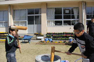 3月8日(日)に卒業生を送る餅つき大会がありました。前日より保護者の方が餅つきの準備し、当日は60㎏の餅をつきました。