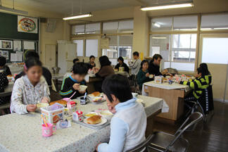 お昼には給食を一緒に食べました。今日の献立の感想や好きなメニューなどをそれぞれの班で話しながら楽しくを会食することができました。