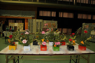 完成した生け花はふるさと祭りで展示し、たくさんの方々に見ていただきました。
