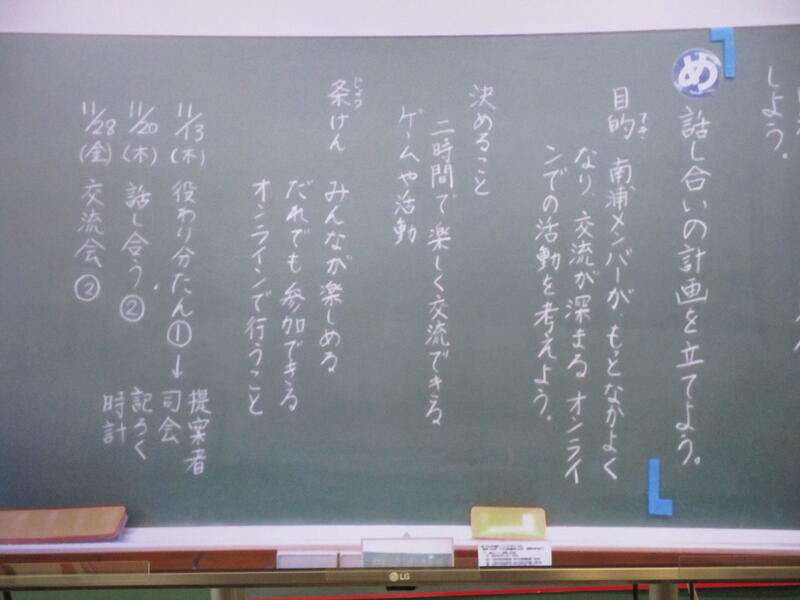 島野浦学園、浦城小、本校の3校で話し合いのオンライン学習を行いました。南浦メンバーでもっと仲良くなる活動を話し合います。今日は、その前段階として話し合いの計画を立てました。役割を決める際に、本校児童は、司会を選びました。「一番たいへんだ。」と言っていました。みんなの意見を聞きながら話し合いを進められるといいですね。