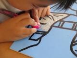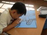 図工で木版画に取り組んでいます。題材は「ハードル走」です。手や足を上げた姿勢でハードルを跳び越す様子を表します。下絵に苦労しましたが、なんとか動きを表すことができました。児童は、買ったばかりの彫刻刀で彫ることを楽しみにしていて、ようやく今日、彫りの作業に入りました。一彫り一彫り一生懸命に彫って、力が入っているのか「首が痛い。はぁー難しい。」とつぶやいておりました。