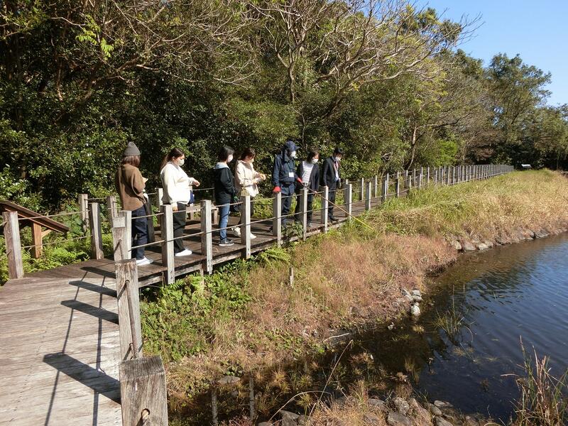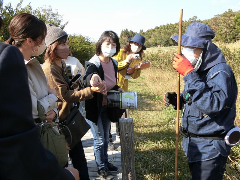 11月8日(火)は、熊野江小・浦城小・南浦中合同による家庭教育学級の視察研修でした。保護者・職員合わせて9名参加しました。はじめに川南町の川南湿原に行き、ガイドの「川南湿原を守る会」事務局長 松浦さんより、川南湿原に生息する希少な生物について、現場で観察しながら説明を聞くことができました。湧き水の池の周りにとても貴重な生物がいることに、みんな驚いていました。ゲシュマックで昼食を食べた後、新富町総合交流センター「きらり」にて、そば打ち体験学習を行いました。講師は、そば処「しんとみの郷」の中下さんでした。中下さんのお手本及び説明を参考にしながら、順を追って5人分の「十割そば」を作ることができました。2つの体験を通して、「環境」と「食育」について学ぶことができ、とても充実した時間を過ごせました。