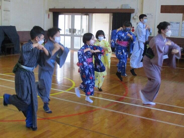 11月から放課後子ども教室で日本舞踊教室が始まりました。講師は、日本舞踊花柳流の皆さん。子どもたちに分かりやすく熱く指導してくださいます。その甲斐あって、子どもたちはめきめきと上達しています。子どもたちに一人一人サイズに合わせて、袴(はかま)や浴衣(ゆかた)も用意してくださり、とても有り難い限りです。