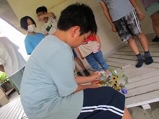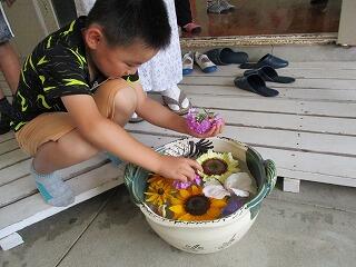 熊野江っ子放課後子ども教室では、6月~7月の始めまで、伝統文化体験としてお茶の先生をお招きして茶道教室を行っています。今回は、出入口の鉢に花を入れて、雰囲気を盛り上げます。