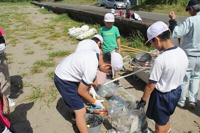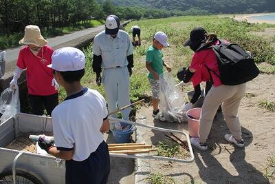 海開きを前に、熊野江海岸の清掃をしました。地域・学校での合同の取組は、雨のためできませんでした。小学校全員で、晴れ間をぬって清掃を行いました。