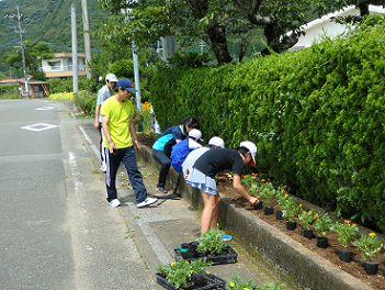 昼休みは、ニルソン先生と外で遊び、グリーンタイムは残っていた苗を道路側の花壇に植えました。暑さに負けず元気な熊小っ子です。