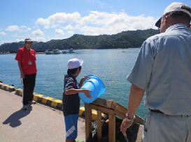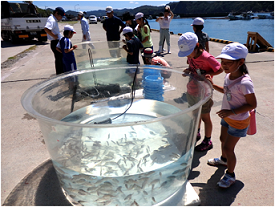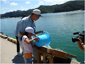 本日、熊野江の海にマダイとヒラメの稚魚を放流しました。こどもたちは「元気に大きくなってほしい。」という願いをこめて、放流台から放流しました。