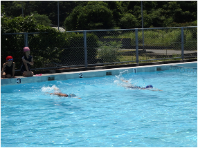 朝から青空です。今日は子どもたちが待ちに待ったプールの日です。「浮けるようになった子ども」、「25mまであともう少し子ども」、「ビート板で使ってバタ足が上手になった子ども」など、学年によって目標は違いますが、1人1人がとても成長したと思います。