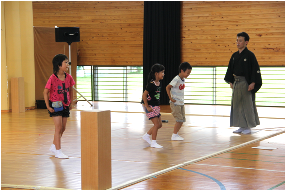 本日の放課後子ども教室で、第1回目のなぎなた教室がありました。昨年度も実施しましたが、今回、初めての子どもが4名いましたので、なぎなたの基本動作(上段、中段、下段、八相の構え)を1つ1つ丁寧に教えていただきました。