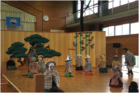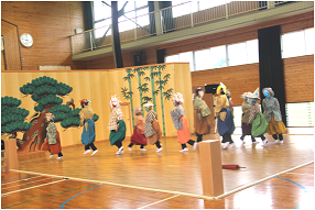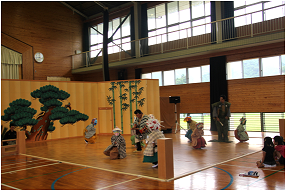 最初に、「狂言」について説明があり、「盆山」という演目を鑑賞しました。次に、1・2年が「狂言」での歩き方や声の出し方などを体験しました。最後に、演目 茸(くさびら)に3年生以上が中学生といっしょに出演しました。