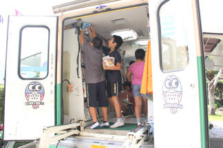 本日、移動図書館「ふくろう号」が来ました。子どもたちは「ふくろう号」が来るのをとても楽しみにしていて、一人で8冊も借りる子どもがいました。