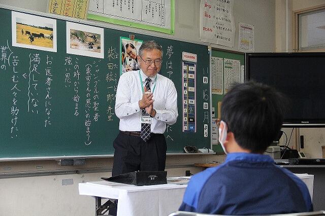 16日(月)の3,4校時は、5,6年生を対象に映画『風に立つライオン』のモデルとなった宮崎県出身の医師、柴田紘一郎先生の生き様を通して、未来の自分の生き方を考える「道徳」の授業を濵砂校長先生に行っていただきました。夢を実現するために努力をし続ける大切さを強く感じました。
