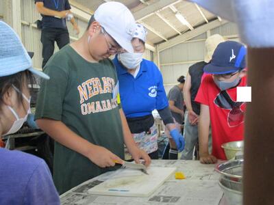 9月16日(土)、はらはらわくわくふるさと体験隊で漁業体験をしました。北浦漁港で、まず、メヒカリをさばく体験をしました。メヒカリの尾の方からウロコをこさぎ、頭の部分を切ります。最初は、戸惑っていた子ども達ですが、一匹、二匹とさばいていく内に慣れてきて、次々にさばいていました。楽しかったようです。
