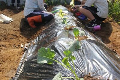 学校技術員さんが畝を作り、冬野菜をみんなで植えました。