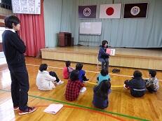 事務の先生は「どっとこどうぶつえん」「まめうしと1.2.3」の2さつの本を紹介しました。2さつの本ともとてもおもしろく、子どもたちも楽しそうに聞いていました。