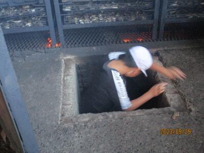 魚の頭を取って、魚を洗い、網棚に並べて干し、火を焚いて時間と日にちをかけて繰り返しいぶします。魚をいぶすために薪をくべるところに許可をいただいて入ってみました。何日もかけて繰り返しいぶした魚は、黒く固くなり、よい香りがします。