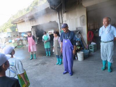9月29日、校区にある高木商店に水産加工業の見学に行きました。祖父の代から続くこの高木商店を経営するのは、3代目の高木さんです。4名の従業員の皆さんが魚を加工する様子を見せていただきながら、商品になるまでの作業工程の説明を聞きました。
