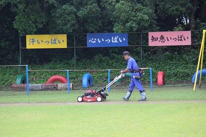 今朝も、芝刈り機の音が運動場に響いています。