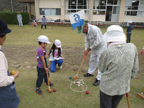 今回の土曜授業は、地域の高齢者クラブの方とグラウンドゴルフを行いました。1学期は雨のためにできなかったので、1年生にとって初めての体験でした。1年生も上級生に負けないぐらい、頑張っていました。高齢者の方にも、「1年生は上手ですね。」とほめていただきました。